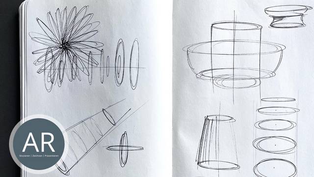 Selbes Objekt zweimal: einmal glatt, kühl, einmal warm, rau – nur durch Strichlagen/Werte. - Explosionsskizze Light (20 min)